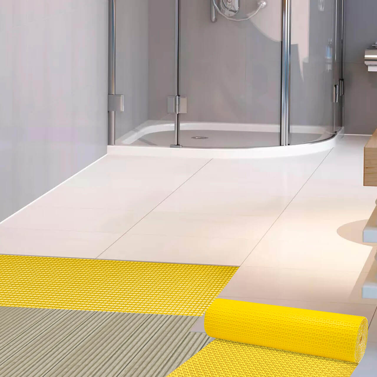 In a wet room Durabase™ CI++ membrane can provide a solution to two problems. It provides protection from moisture penetration. It also absorbs any movement in the substrate. This would typically be either wooden boards or screed materials laid so as to achieve the falls in the surface to drains etc. This combination of benefits makes this product very useful in wet room situations.